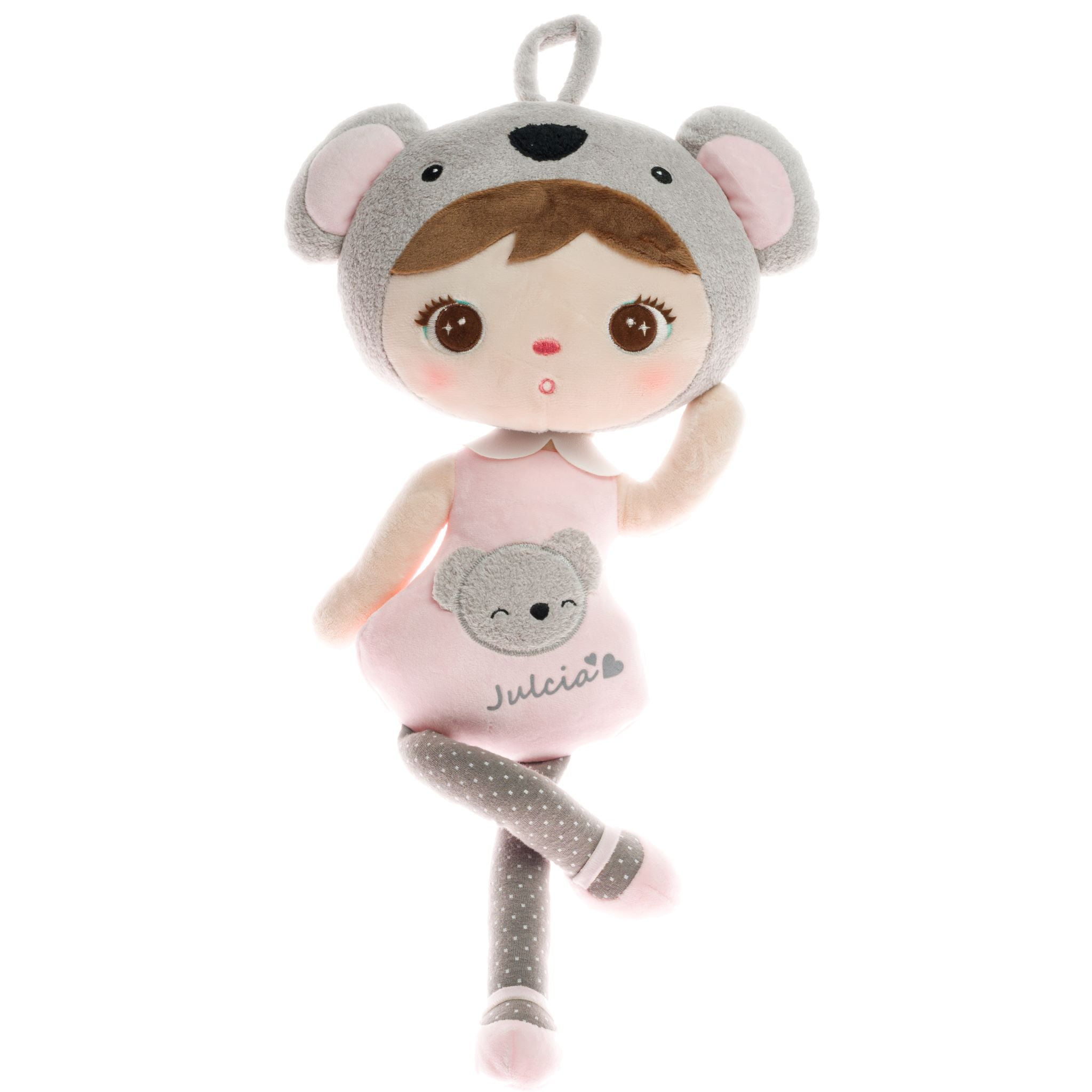Ihr rundes Gesicht wird von einem Hut mit einem Teddybärbild geziert. Große Ohren, eine Nase und Augen wie kleine Kohlen tragen zu ihrem Charme bei. Das Puderrosa des Kleides passt perfekt zur Farbe des auf ihren Bauch genähten Koalas. Graue Strumpfhosen mit rosa Punkten und die Schuhe, die ihre Füße krönen, sind ebenfalls unglaublich niedlich.