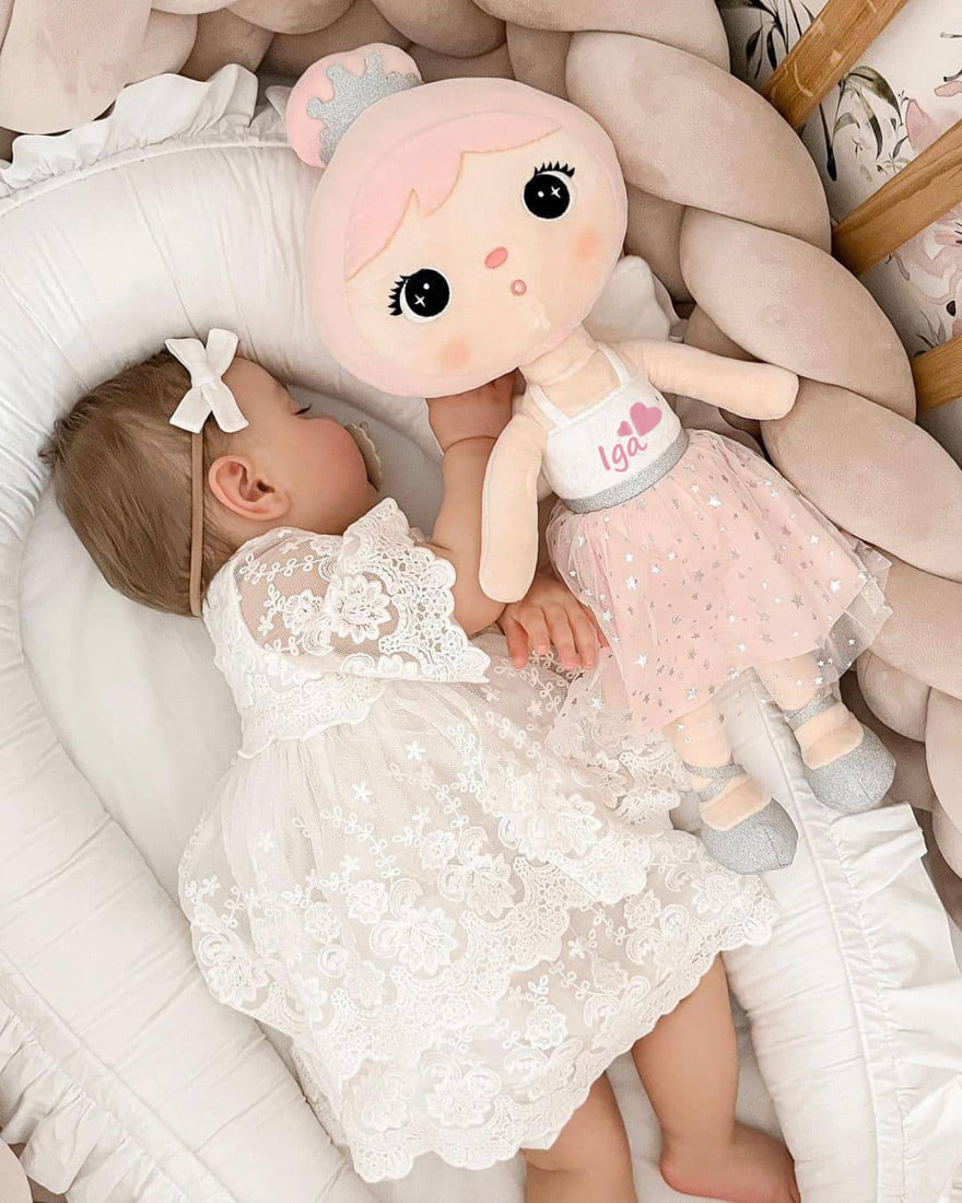 Dieser bezaubernde rosa Engel wird im Nu das Herz jedes kleinen Mädchens erobern! Weiche Plüschflügel und die Möglichkeit, eine Geburtsurkunde oder eine Widmung hinzuzufügen, machen diesen Engel zu einem wahrhaft einzigartigen Geschenk. Zarte Puderrosa- und Weißtöne verleihen der Puppe eine himmlische Ausstrahlung, während schimmernde silberne Elemente wie die Krone und die Details ihres Kleides sie nicht nur gemütlich, sondern auch unglaublich elegant wirken lassen. Die großen, bezaubernden Augen des Engels scheinen zu sagen: „Ich bin hier, um über dich zu wachen“, und der weiche Stoff lädt geradezu zum Kuscheln ein, während sie einschläft. Diese Puppe ist mehr als nur ein Spielzeug – sie ist ein einzigartiges Erinnerungsstück, das ein Leben lang hält und Ihr Kind von den ersten Lebenstagen über Taufe, Geburtstag bis zur Erstkommunion begleitet.
