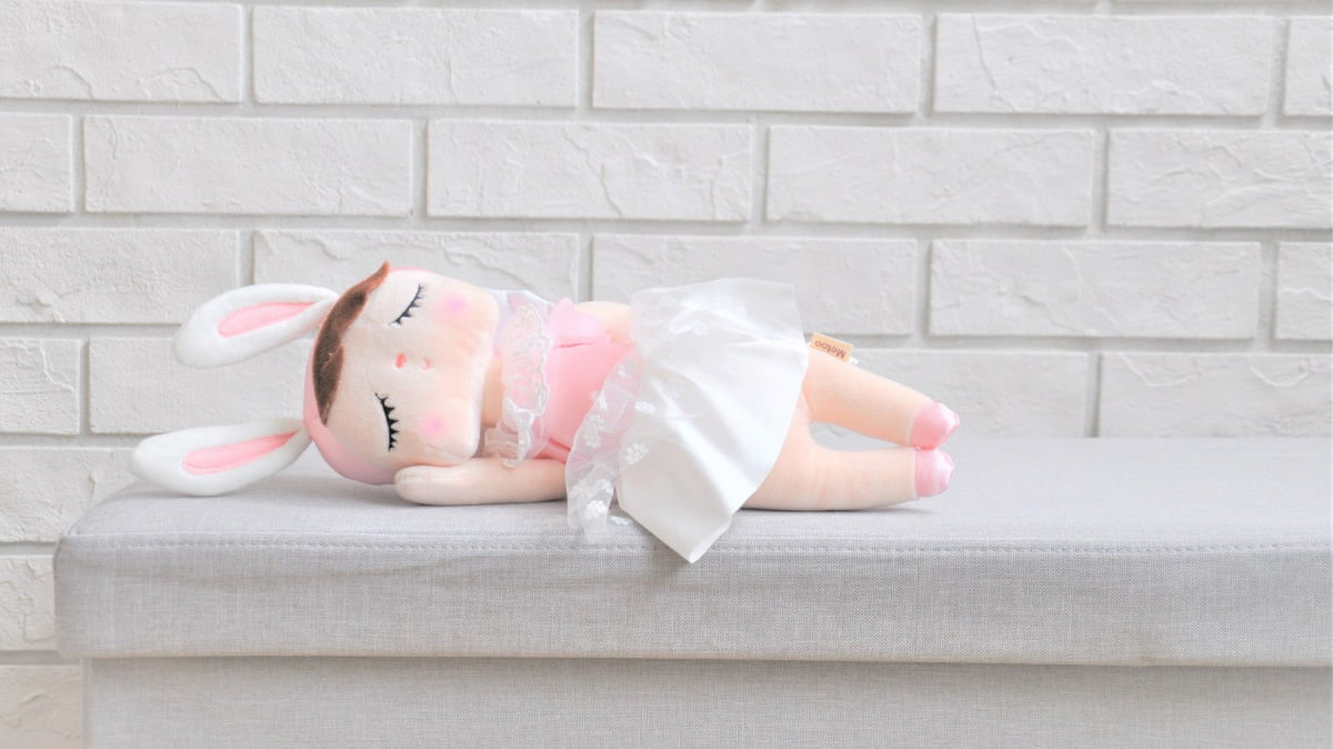 Weiches Material, Plüschohren und ein weiß-rosa Kleid