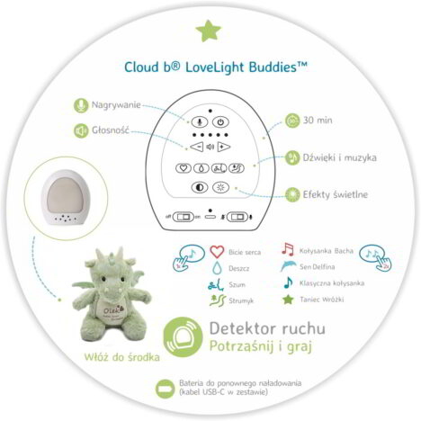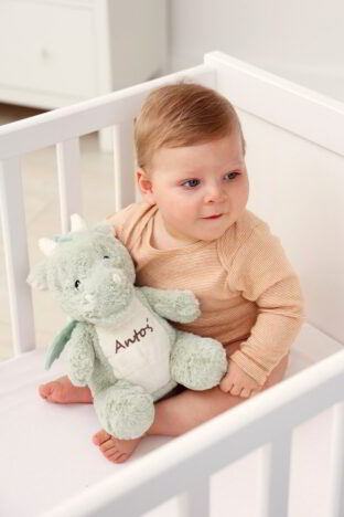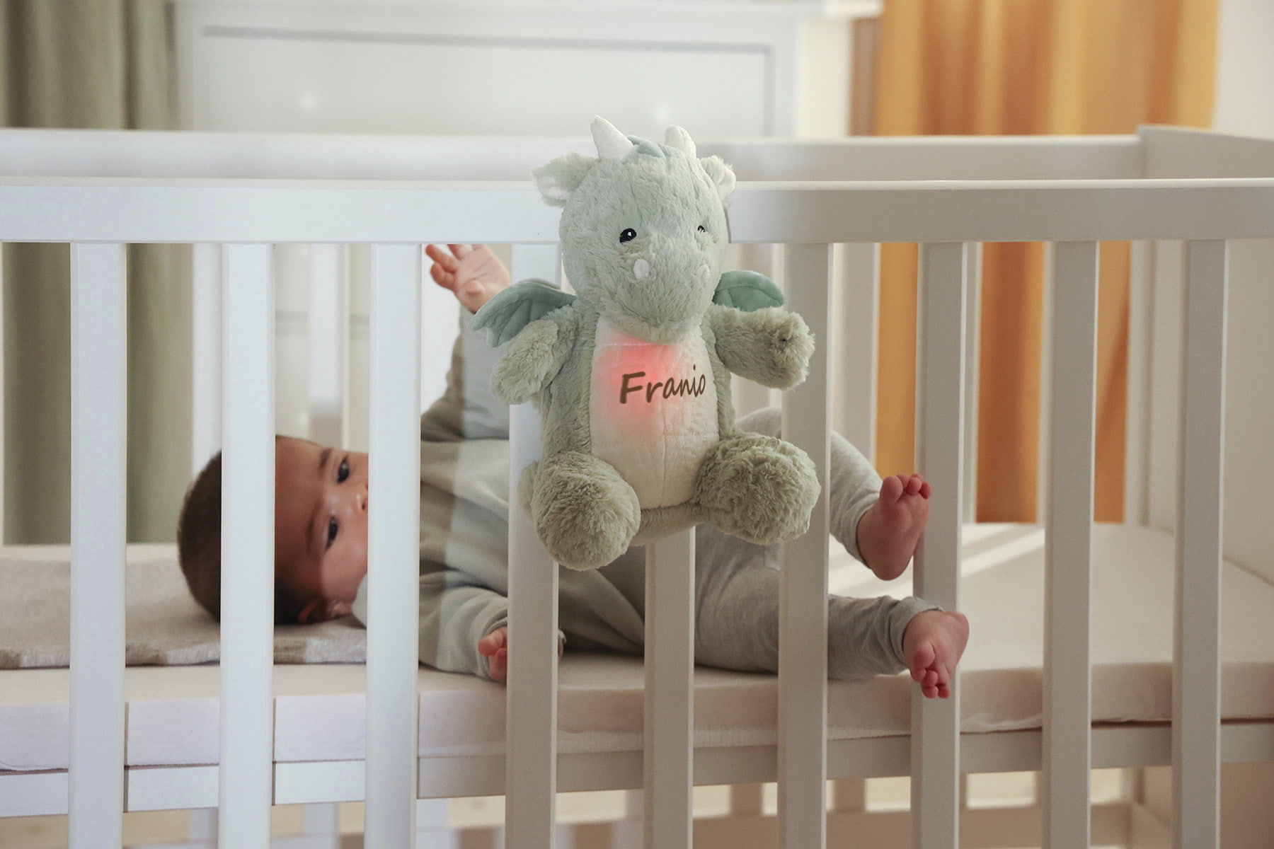 Es wird dunkel im Kinderzimmer, aber keine Sorge! Dieser weiche, personalisierte Freund wacht über den friedlichen Schlaf Ihres Kindes. Unser summender Drachenbär mit Aufnahmefunktion und Babys Namen auf dem Bauch verwandelt ein dunkles Zimmer in eine gemütliche Höhle voller beruhigender Klänge und sanftem Licht. Sobald Ihr Baby den Drachen bewegt, aktiviert der intelligente Bewegungssensor beruhigendes weißes Rauschen, das wie ein Zauberstab wirkt und die Sinne Ihres Babys weckt. Sie können auch eine kurze, persönliche Widmung auf den Bauch des Drachen schreiben – Worte der Liebe, Wünsche oder ein Motto, das Ihr Kind jeden Abend begleitet.