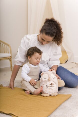 - ✔️ Personalisierung: Name des Kindes und Widmung auf dem Bauch der Eule