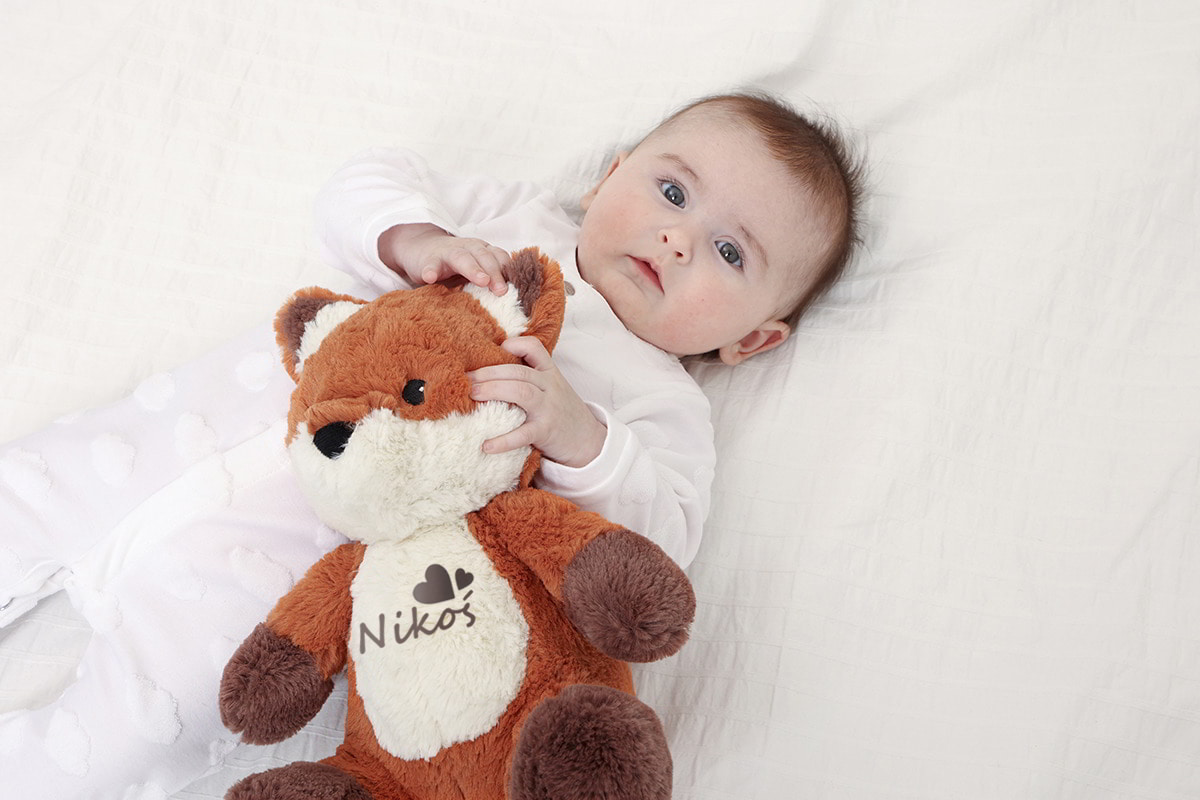 Suchen Sie ein einzigartiges Geschenk zur Geburt? Ein personalisierter Fuchs mit 8 Soundoptionen ist die perfekte Wahl! Schreiben Sie den Namen Ihres Babys auf das Kuscheltier – so wird es zum ersten persönlichen Freund Ihres Kindes und begleitet es viele Jahre lang beim Schlafen und Spielen.
