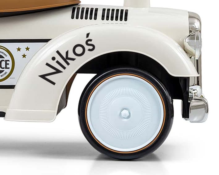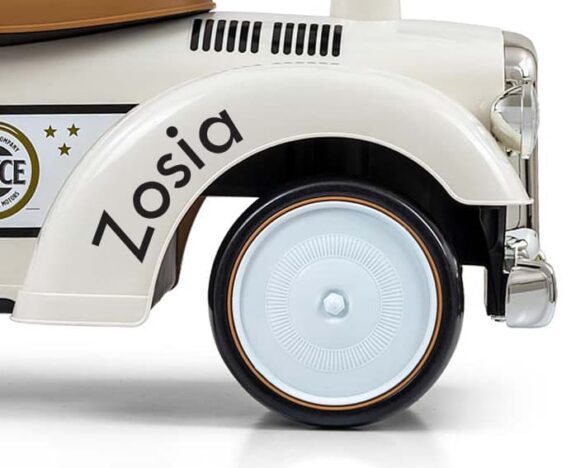 ✔️ Für die Personalisierung verwenden wir Polymerfolie, genau wie bei der Fahrzeugfolierung. Die Farbe verblasst nicht, auch nicht im Freien. Bei Bedarf lässt sich der Aufkleber problemlos entfernen. Die Oberfläche des Rutschautos wird dabei nicht beschädigt. Das ist besonders praktisch, wenn das Rutschauto an ein jüngeres Geschwisterkind weitergegeben wird. Unser Designer wählt Größe und Position des Namens aus. Der Effekt ist ästhetisch ansprechend und passt zum Design des Fahrzeugs.
