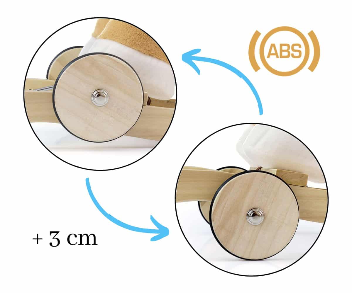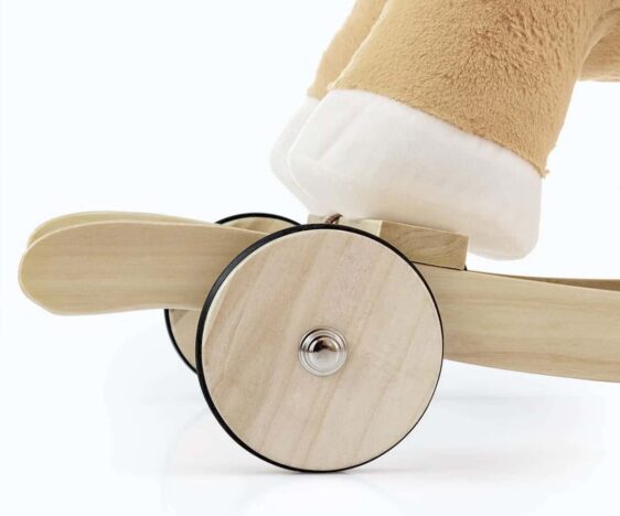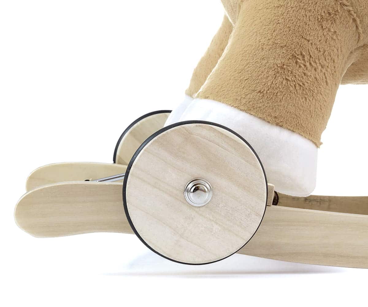 ✔️ Es ist kinderleicht! Unter den Kufen befinden sich faltbare Räder, die sich ohne Werkzeug schnell ausklappen lassen. Drehen Sie sie einfach um 90 Grad, sodass sie unter die Kufen hinausragen, und schon verwandelt sich das Schaukelpferd in ein Reittier. Es dauert buchstäblich nur wenige Sekunden und erfordert keinerlei Fachkenntnisse – jeder Elternteil kann das.