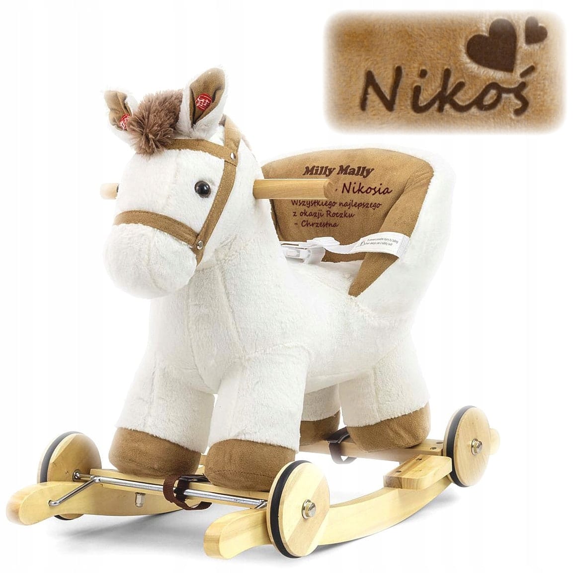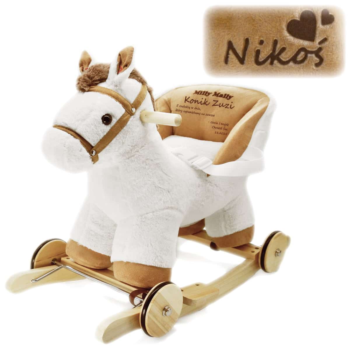 Stellen Sie sich diesen rührenden Moment vor, wenn Ihr Kind zum ersten Mal auf seinem eigenen Pferd sitzt, graviert mit seinem Namen und einer Widmung von Ihnen! Dieses wunderschöne weiße Ross wird schnell zu Ihrem liebsten Spielgefährten.