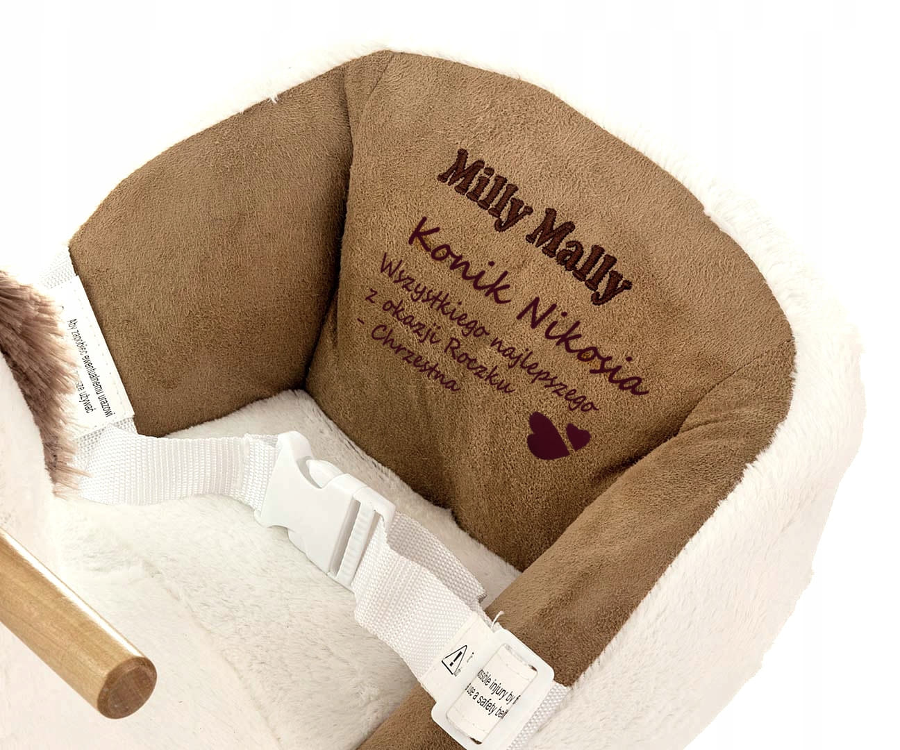 Die Personalisierung erfolgt mit einer eleganten Samttextur. Name und Widmung werden auf dem Rücken des Pferdes angebracht. Das Ganze passt wunderbar zum Weiß des Pferdes und den beigen Akzenten.